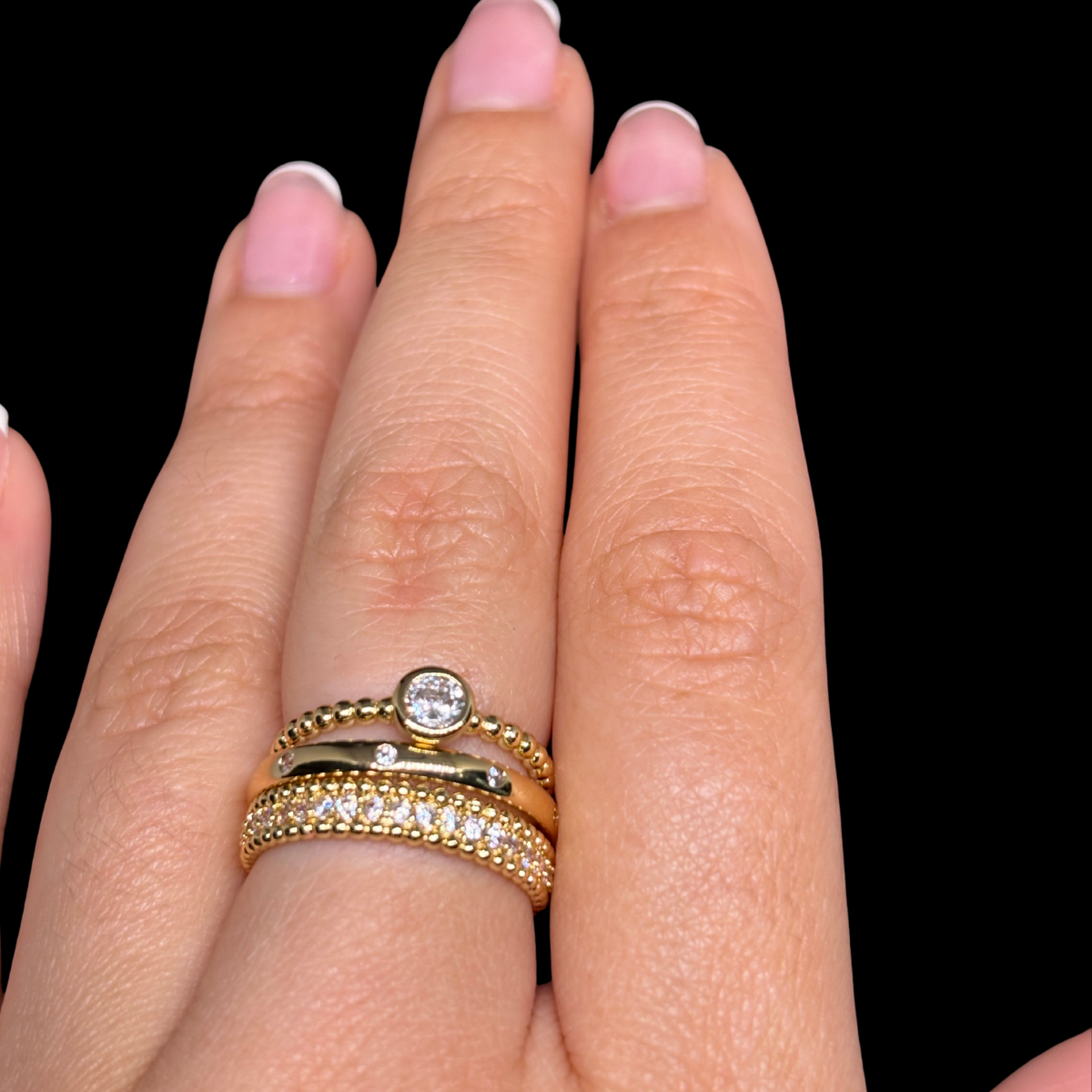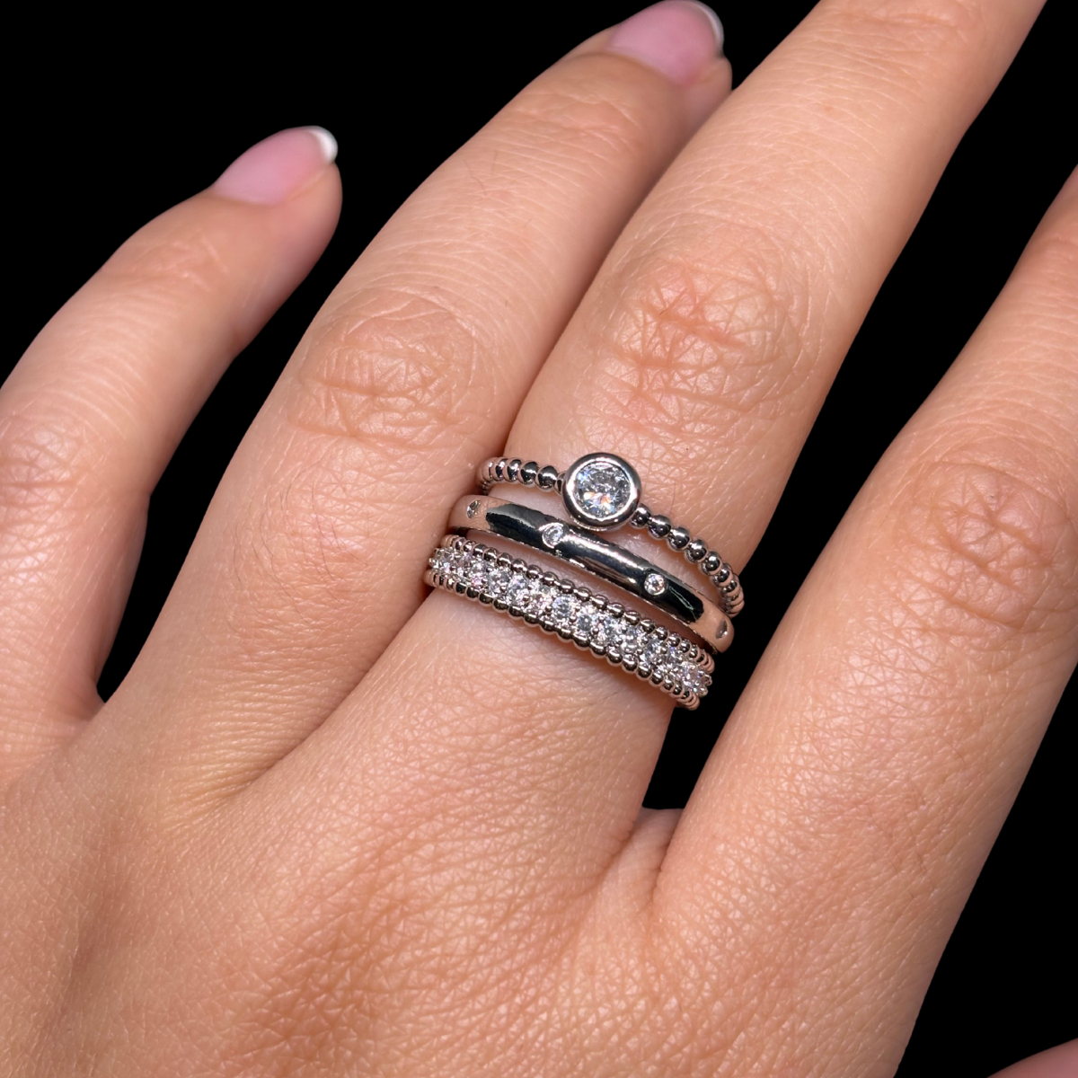 Elevate your style with the Aurora Stackable Ring Set, a trio of radiant designs crafted to be worn together or separately. Each ring brings its own touch of elegance: a beaded band with a bezel-set crystal centerpiece, a sleek polished band with subtle accents, and a sparkling pavé band for extra brilliance. Available in both silver and gold finishes, this versatile set is perfect for creating your own unique stack or making a statement with just one.