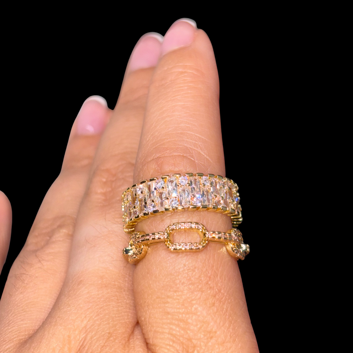 The Radiance Duo Ring Set is a celebration of light and luxury. The first band shimmers with a full circle of brilliant baguette-cut stones, creating an endless sparkle from every angle. The second, a modern chain-link design encrusted with pavé stones, adds a bold yet refined contrast.